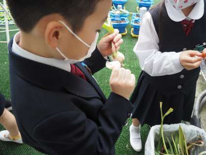 2年生の生活科では、花が咲き終わったチューリップを土から引き抜きました。土の中の球根の様子をじっくり観察した後、球根部分を切り取り、水洗いして乾かしました。様々な大きさや形に興味をもって取り組むことができました。
