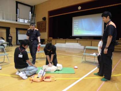 普通救命講習会を実施しました。中央消防署の救急隊・消防隊の方が講師として、いざという時にどうすればいいかの指導を受けました。教職員だけではなく、保護者の方にも多数参加していただきました。