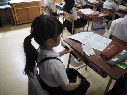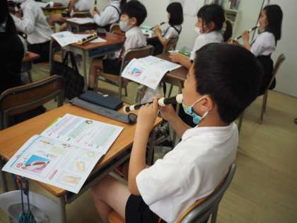 姿勢を正して、指でしっかり穴をふさぎ、静かに息を吹き入れると美しい音が出ます。今日は「シ」の音の練習。みんなで順番に吹いたり、一緒に吹いたりして楽しく学習しました。思い通りの音が出ると笑顔があふれました。