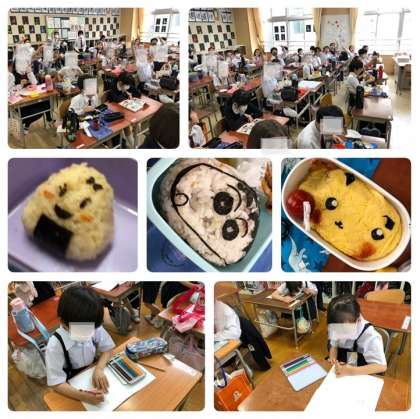 今日は、1、5年生の遠足が雨のため延期となり、教室でお弁当を食べていました。1年生は、給食を取りに行って、盛りつけて、配ってという準備がないため、いつもよりとても早く食べ始めることができていました。教室をのぞいてみると、ほとんどの人がお弁当を食べ終わり、本を読んだり、絵を描いたりして食後の時間を過ごしていました。5年生は、お弁当の時間を満喫していました。カメラに向かってみんなでピース!!「あー、おいしかった!!」という声も聞くことができました。