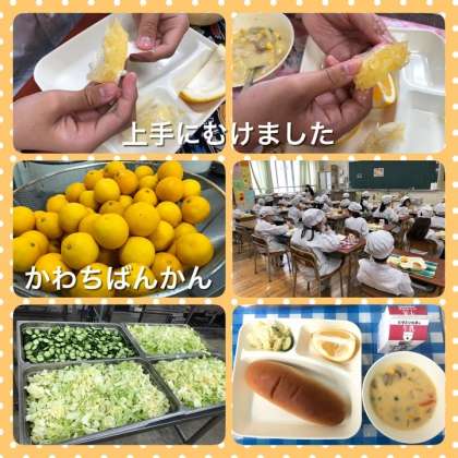 今日の給食は、コーンクリームシチュー、キャベツときゅうりのサラダ、かわちばんかん、黒糖パン、牛乳です。シチューには、ラッキーにんじんが入っていました。本校の給食調理員さんが5人に1人の確率で当たるように、たくさん作ってくれていました。「花の形のラッキーにんじんが入っていた!!」と知らせてくれた人もいました。シチューのルウも給食室で手作りしているので、濃厚でおいしかったです。かわちばんかんは、皮が厚くむきにくい柑橘類の一つです。上手にむくことができているか、6年生の教室をのぞいてみると、さすが6年生です。実が出てくるところまできれいにむいて、パクっと食べていました。