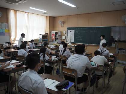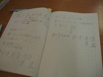 6年生算数「分数のかけ算」では、これまで学習したことを使って、いろいろな分数のかけ算の計算の仕方を考えました。一人一人がより正確に計算できる方法を考え、交流する中で、考えを深めることができました。