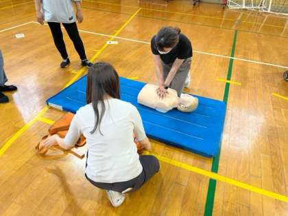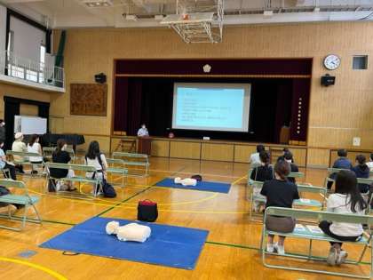 昨日の放課後、PTAの保健体育委員会の呼びかけで参加していただいた保護者の方々と教職員による普通救命講習がありました。救命措置の大切さを学んだ後、心肺蘇生とAEDの使い方を実技訓練を行いました。万が一の時に備えて、一人一人ができることをしっかりと確認することができました。