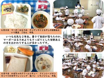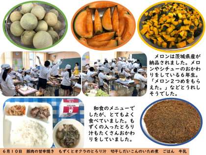 今週の給食で一番の話題は、クインシーメロンでした。おかわりの立候補、じゃんけん大会が各クラスで行われていました。今が旬の果物ですが、種の周りが最も甘く、その次は種より下(底)の部分だそうです。甘いところが当たったでしょうか?子ども達の喜ぶ姿が見られました。