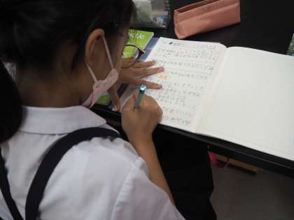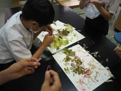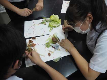 6年生理科「植物のつくりとはたらき」では、スーパーマーケットに売っている野菜が生きているのだろうかという課題を解決するために、野菜が水を吸うかどうかを実験で確かめました。3つの野菜が色水で染まる様子を観察した後に、野菜を切ったり、裂いたりしながらその様子をより詳しく調べました。一人一人が意欲的に実験に取り組み、気づいたことは、ノートにたくさん書き記すことができました。