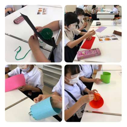 手作りクラフトクラブでは、フェルトと毛糸を使ってペン立て作りをしました。穴あけパンチで穴をあけたフェルトに毛糸を通して、側面と底を縫い合わせ、形を作っていきます。家庭科で裁縫を学習していない4年生でも取り組みやすくしています。形ができたら飾りつけです。リボンや型抜きしたフェルトなど、それぞれ工夫して自分らしい飾りを考えていました。次回も引き続き取り組み、ペン立てを完成させます。実際に家で使う日を楽しみにしていてほしいです。
