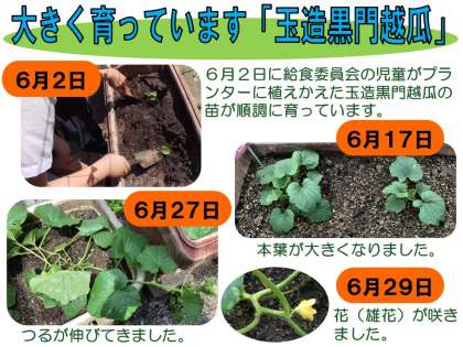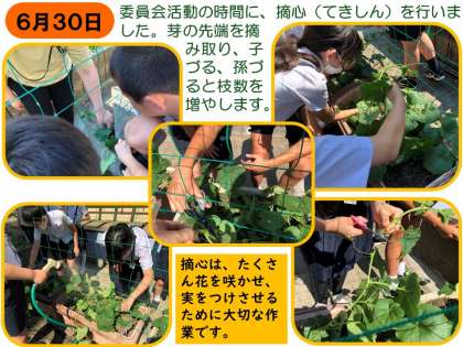 給食委員会の児童による玉造黒門越瓜の栽培ですが、2年生と開援隊の方々によってきれいに雑草抜きをしていただいたルーフテラスに委員会活動の時間を利用して行きました。今回は、摘心を行いました。それぞれの親づるの本葉が7枚くらいになったところで摘み取ります。委員会の児童は、「1、2、3、4、5、6、7枚目、ここだ!!」と本葉の数を数えて、先端を切り落としました。育っているつるを途中で切るということは、「いいのだろうか?」とドキドキするようです。間違っていないかと不安そうでしたが、コツがわかれば上手に摘心をすることができました。栽培を通して、いろいろな作業の大切さを知ってほしいです。