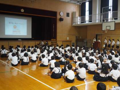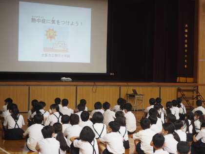 今朝の児童朝会では、保健委員会が「熱中症に気をつけよう」と全校のみんなに呼びかけました。どのようなことに気をつければよいのか、マスクを外さなければならない場面など、具体的な話をしっかりと聞くことができました。