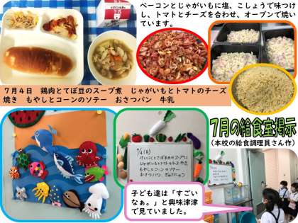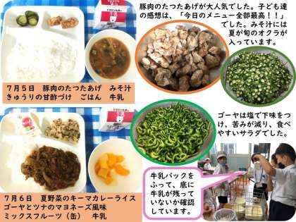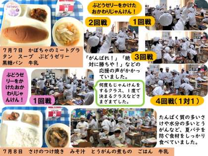 最近の給食では、パンが食べにくい状況が続いています。暑さで水分を欲しがっている体にとって、水分をとられる感覚のあるパンの食が進まないということがあると思います。その他のおかずは、旬の夏野菜、暑さに負けない体をつくるたんぱく質の多い食材など、しっかり食べることができていました。