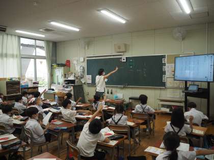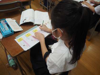 1年生国語では、漢字の学習が始まりました。今日は、「一」と「二」の二文字。漢字の読み方では、「ひとつ」や「ふたつ」と書くときには、送り仮名をつけて使うことをみんなで確認しました。書き順を確かめてみんなで空書きした後に、漢字ドリルに丁寧に書くことができました。