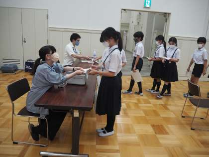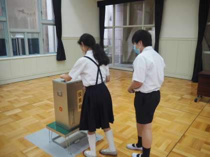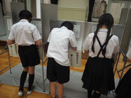 模擬投票では、投票案内状を受付で確認してもらい、投票用紙を受け取って候補者名を記入。本物の投票用紙や、記載台、投票箱を準備していただいていたので、実際の選挙さながらの体験ができました。