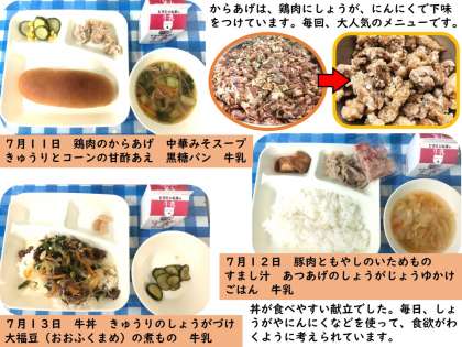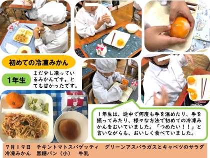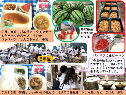 19日で1学期の給食が終了しました。最後の1週間も、人気のからあげや牛丼、おいしい果物のすいかや冷凍みかん、赤ピーマンや鶏肉、いかのうま味がたっぷり出て深い味わいのパエリアなど、バラエティー豊かなメニューがたくさん登場しました。毎年、なぜか冷凍みかんの日は、雨で天気が悪かったり、夏なのに寒い日だったりしますが、今年もやはり雨でした。手が冷たくなりながらも、甘味の強い冷凍みかんをおいしく食べていました。最もよく食べていたのが、ツナっ葉いための日です。ごはんが食べやすい献立でした。2学期からの給食も楽しみにしてほしいです。