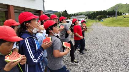 カレーに続いてスイカです。種飛ばし競っています。何でも楽しい子どもたちです。