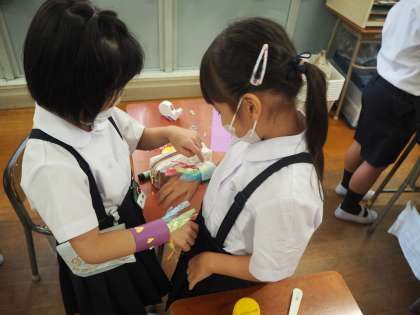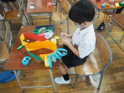 2年生図画工作では、画用紙で作ったわっかを利用して体につけるかざりをつくりました。