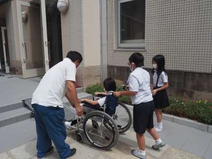 後半の介助体験では、グループごとに友達が乗った車いすを押して、坂道や段差を移動しました。乗っている友達が怖い思いをしないように、配慮しながら車いすを押すことができました。