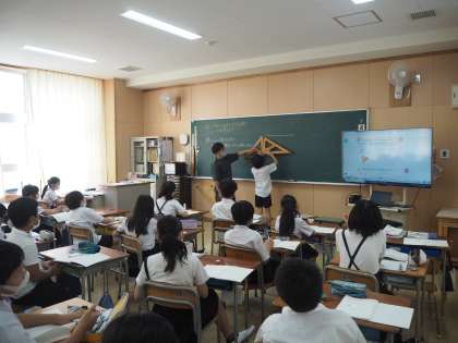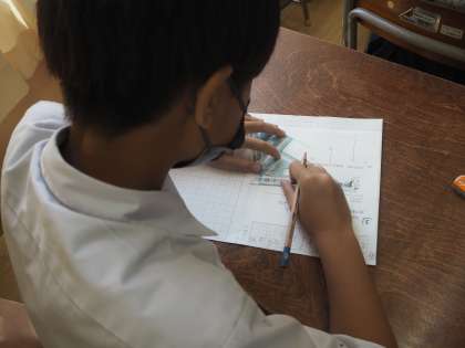 4年生の算数「垂直と平行」では、平行な直線をかく方法を考えました。2枚の三角定規をどのように使えばよいか、それぞれの考えを出し合って話し合うことで、平行な直線を正確にひける方法を見つけていきました。定規をうまく固定しながらかくことに苦労しながらも、方向等に違いがある問題に取り組むことで、少しずつ自信をもってかくことができるようになりました。
