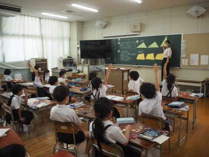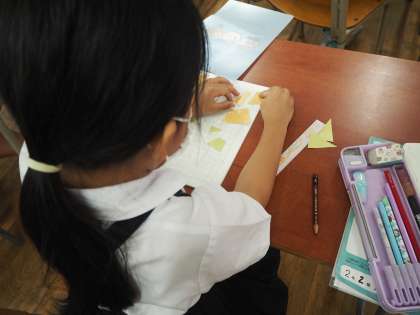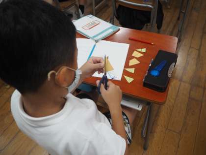2年生算数「三角形と四角形」では、三角形や四角形を1本の直線で2つに切るとどんな形ができるかを調べました。一人一人が自分の図形に直線をかいて切りながら、どのような形ができるのかを確認する中で、直線のひく場所によって、できる形が違うことを見つけていきました。