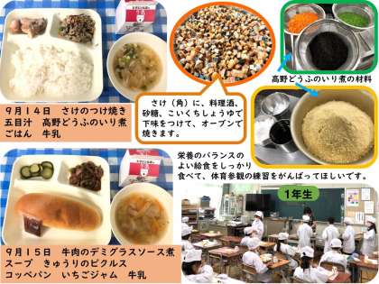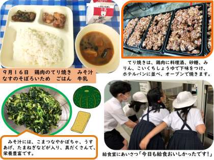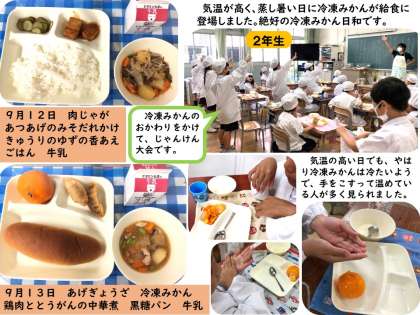 9月13日に冷凍みかんが登場しました。今まで、なぜか冷凍みかんが出る時は、天気が悪かったり、肌寒かったりと、冷凍みかん日和ではありませんでした。今回は、暑くて冷凍みかんを食べるのにぴったりの日!!子ども達がどのような反応をするのかが楽しみでした。予想とは違い、天気が悪い時と同じ、「寒い。寒い。冷たい。」と言いながら手をこすったり、温めたりしていました。9月16日のなすのそぼろいためでは、なすが苦手な人も少し減らすだけで残りはがんばって食べたり、好きな人がおかわりをしたりして、どのクラスもほとんど残食なく食べていました。給食では、子ども達の新鮮な姿や変わらないがんばりなどを見ることができます。