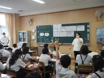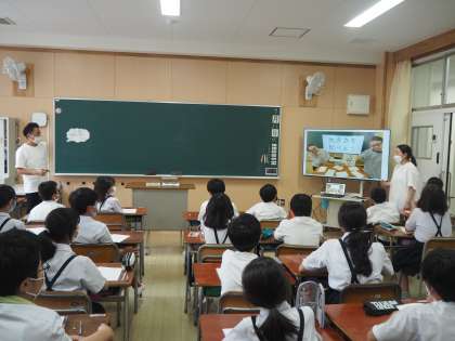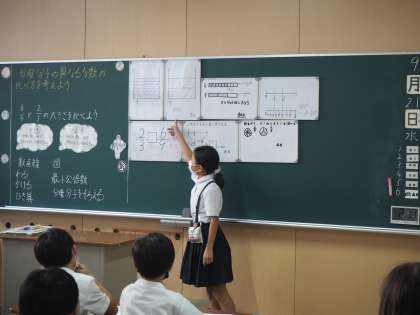 5年生算数の「分数の大きさ」では、分母・分子が異なる分数の大きさの比べ方について学習しました。これまで学習したことを生かしてどのように考えればよいかを一人一人がノートに書いて考えを交流した後、学級全員でそれぞれの考えの似ているところや違うところに着目しながら、話し合いを深めていきました。みんなの気づきから出されたキーワードをもとに、一人一人が学習したことをまとめることができました。