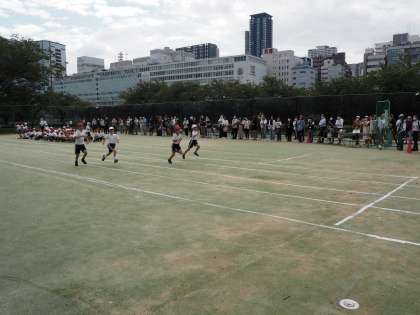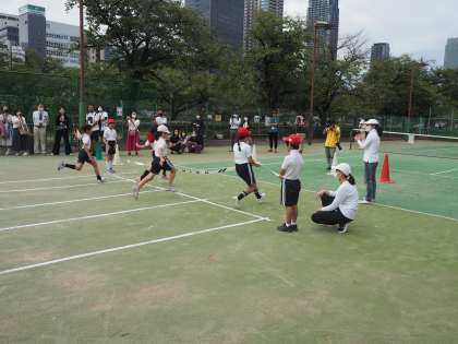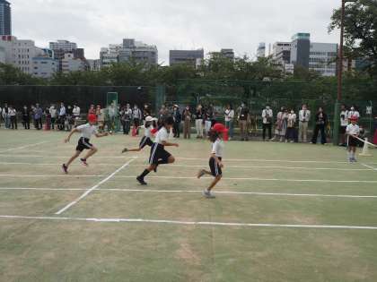 かけっこは、直線を全速力。ゴールテープを目指して走りました。