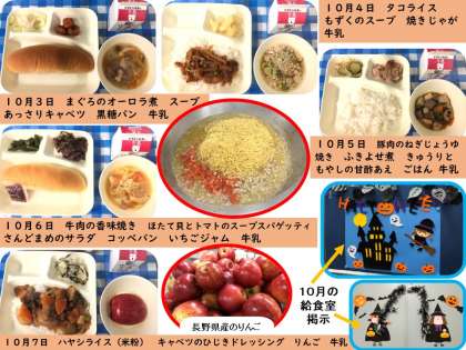 10月の給食で特に人気が高かったのは、鶏肉のたつたあげやみそカツなどの揚げ物です。また、タンタンめんも人気がありました。このような人気メニューが出た時は「給食が1番おいしい!!」、「年に1回ではなくて10回ぐらい食べたい。」などの感想を伝えてくれます。この時期から登場する果物としてりんごやみかんがありますが、みかんはまだ皮が緑色の極早生みかんです。子ども達から「みかんの皮がなんで緑色なんだろう。」という声があがっていました。担任の先生から「早生(わせ)といって、早い時期のみかんだからだよ。」と説明がありました。給食を通して、食育が行われています。