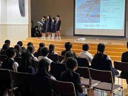 3年生は、これまで取り組んできた福祉に関するさまざまな学習について、実演をしたり、ボードを示したりしながら発表しました。4年生は、防災についてグループごとにテーマを決めて学習してきたことを、1人1人がパソコンで工夫してまとめて発表しました。