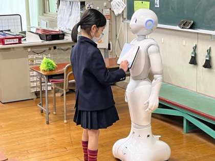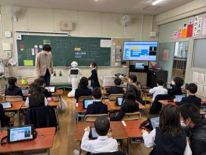 1年生では、初めてプログラミング学習をしました。一人一人がタブレットで自分の名前や好きなもの、好きなことをプログラミングし、作った自己紹介のプログラムをpepperで確認することができました。話す速さや高さ、動きをつけるなど、色々と試しながら工夫する様子も多く見られました。
