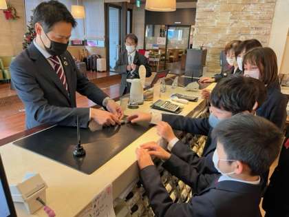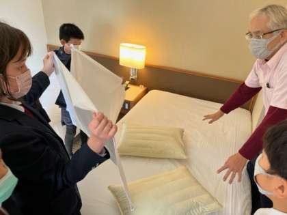ホテル訪問では、ホテルの仕事についてクイズも交えながら分かりやすく教えていただいた後、フロントの仕事を体験させてもらったり、ベッドメイキングを教えてもらったりしました。