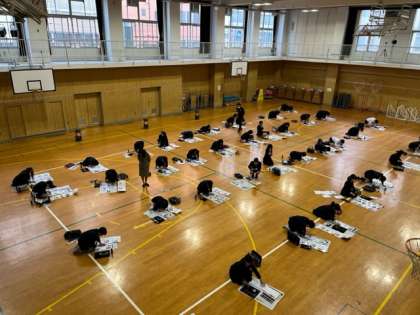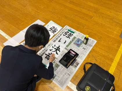 5年生は、体育館で書き初めを行い、「強い決意」という言葉を書きました。一文字一文字手本を見ながら丁寧に書いたり、勢いよく力強い文字を書いたり、スタイルは個々に違いますが、それぞれに今年の抱負を心にもって真剣に取り組むことができました。