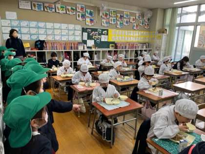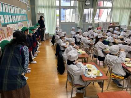 月曜日、愛珠幼稚園の年長組さんが1年生の給食の様子を見学に来ました。