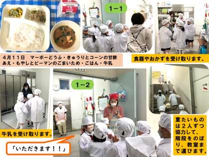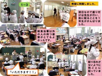 令和5年度の給食が始まりました。1年生も他の学年と同じくさっそく今日から給食です。担任の先生に教わりながら、順番に並んで給食室に給食を取りにきました。とてもしっかりと食器やおかず、牛乳などを教室まで運んでいました。牛乳にストローをさすことが難しかったようですが、担任の先生から「また、明日も練習したら大丈夫だよ。」と言ってもらっていました。初日は例年カレーライスのことが多いですが、今年度はおはしを上手に使わないと食べることが難しい献立でした。そんな中でも1年生は上手におはしを使って食べていました。これからの給食も楽しみにしてほしいです。