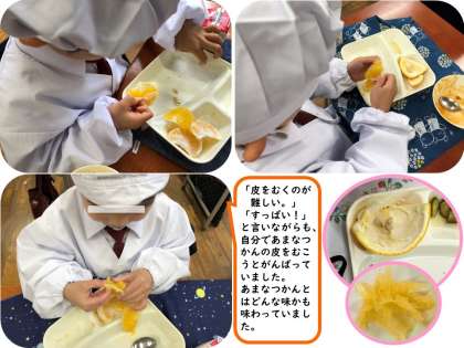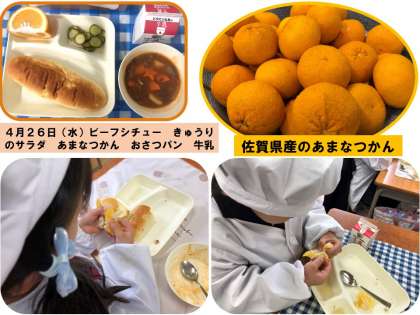 今日の給食は、ビーフシチュー、きゅうりのサラダ、あまなつかん、おさつパン、牛乳です。ビーフシチューには、ラッキーにんじんが入っていました。あまなつかんは、佐賀県産が納品されました。今が旬の果物です。あまなつかんのように皮があつく、かたい柑橘類は、小学生にとってはとてもむくのが難しいです。今日のあまなつかんは、少しすっぱさもありました。1年生も初めてのあまなつかんの皮むきに挑戦していました。できる人は外側の皮を自分でむき、うす皮も切れ目を入れてむいていました。食べてみた感想は「すっぱい!!」「すっぱいけれど甘みもある。」「おいしい。」「レモンみたい。」など様々でした。また、果物の種類やおいしい時期を知り、自分で食べることができるように練習していってほしいです。