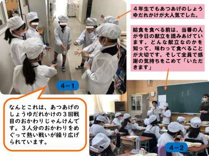 今日の給食は、鶏肉とじゃがいもの煮もの、あつあげのしょうゆだれかけ、紅ざけそぼろ、ごはん、牛乳です。元気いっぱいの4年生、5年生の教室をのぞいてみると、あつあげのしょうゆだれかけや紅ざけそぼろが大人気でした。あつあげは個数ものなので、そんなにたくさんの量はありませんが、おかわりを求めてたくさんの人が並んでいました。他の学年の児童からも「今日の給食全部めっちゃおいしかった!!」という感想が聞かれました。紅ざけそぼろがあったので、ごはんも食べやすく、ごはんも全学年でほとんど残っていませんでした。