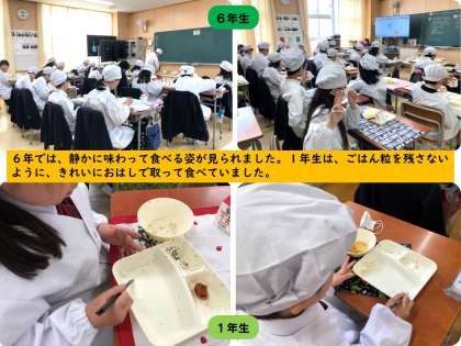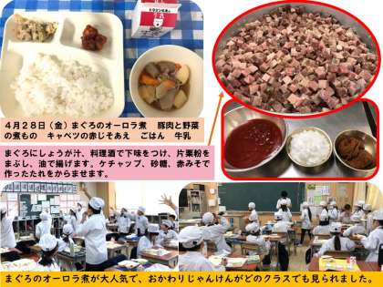 4月28日(金)の給食で、まぐろのオーロラ煮が出ました。昨年度、本校で給食の好きな魚メニューのアンケートをとりました。その際に、まぐろのオーロラ煮は全学年で1位になった人気ナンバー1のメニューです。数日前から「人気メニューのまぐろのオーロラ煮が出るわ!!」という声が児童から聞かれました。やはり、当日も大人気で、おかわりをめぐってのじゃんけん大会が行われたり、おかわりに並ぶ列が見られたりしました。初めてまぐろのオーロラ煮を食べる1年生からは、「まぐろは苦手だったけど、オーロラ煮は食べられた。」という感想が多くありました。刺身としてはあまり好んで食べてこなかったのかもしれません。6年生の教室では、さすがに最高学年という姿で静かに味わって給食を食べていました。1年生では、ごはん粒を残さないという食べ方を担任の先生から教わり、おはしで集めながら食べている姿が見られました。