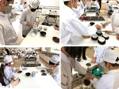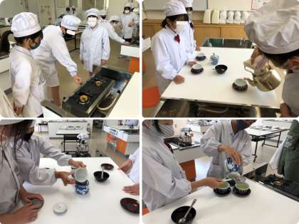 5年生が家庭科で初めての実習を行いました。ガスこんろの使い方や湯のわかし方、きゅうすでの日本茶の入れ方などを学習しました。点火つまみを回してやかんで湯をわかし、沸騰とはどのような状態のことをいうのかを確認したり、熱湯をそのままきゅうすに入れるのではなく、茶わんに一度入れて温度を冷ましたり、きゅうすのお茶を少しずつ順番に茶わんにつぎ分けたり、担任の先生から教わったことを確実に行っていました。自分達でいれた日本茶の渋みも味わっていましたが、みんなでとても意欲的に取り組むことができました。後片付けまでしっかりと行いました。