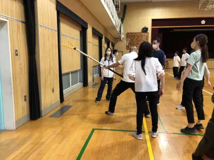 教職員の研修として防犯研修を行いました。校内に不審者が侵入した時の基本行動を理解する、的確に行動できる態度を身につけるということで、非常時の連絡方法や避難方法、さすまたの使い方などについて東警察署の方々に教えていただきました。