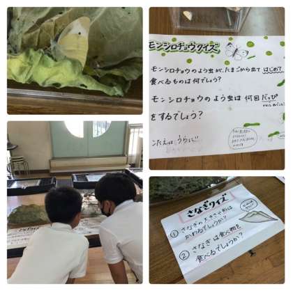 3年生は理科の学習でモンシロチョウとアゲハチョウを育てています。幼虫⇒さなぎ⇒成虫と育てる中で観察し、見た目や育ち方、体のつくりなどの特徴について知ったり、比較して共通点や違う点に気が付いたり、生物についての理解を深めます。「モンシロチョウがさなぎから成虫にかえった!!」などと毎日しっかり観察しています。