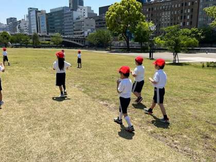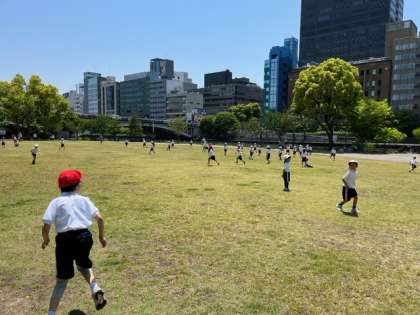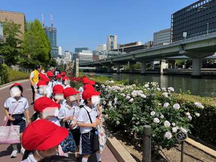 夏を感じる晴天の下、一年生は中之島公園に歩いて遠足に行きました。