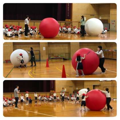 体育参観の練習が始まっています。今日は雨でしたが、体育館で2年生が大玉転がしの練習をしました。自分たちの身長よりも大きい大玉を転がすには、力加減やスピード調節、コーンを回る際のコツなどが必要で、難しいですが、とても上手に転がしていました。大玉を転がしている友達へ「がんばれー!!」という声援もとんでいました。体育参観の本番が楽しみです。