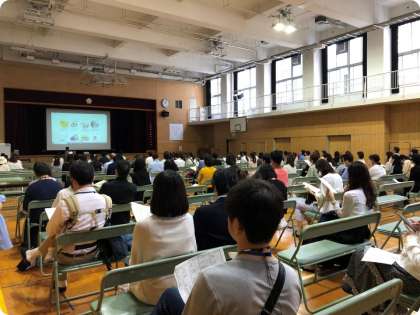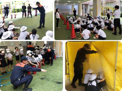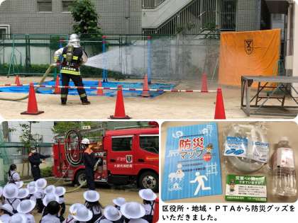学習参観後にPTA予算総会が体育館で開かれました。運動場では、1〜3年生、4〜6年生の順で防災訓練を行いました。防災訓練では、消火器の使い方や火事で煙が出た際の避難方法、消防車の仕組みなどについて中央消防署の方々から教えていただきました。消火器の使い方は、「ピン(黄色のピンを抜く)・ポン(ノズルを持って伸ばす)・パン(レバーを握って放つ)」の3段階で出来ることを知りました。しかし、まだ子どもなのでその場から逃げて、大人に知らせることが最も大切であると教えていただきました。煙体験では、手で壁をさわりながら、ハンカチを口に当ててしゃがんで進む方法を体験しました。消防車の仕組みでは、はしごが何メートルまで伸びるのかやホースを収納する場所や水を積む水槽があることなど、子ども達からの質問にたくさん答えていただきました。