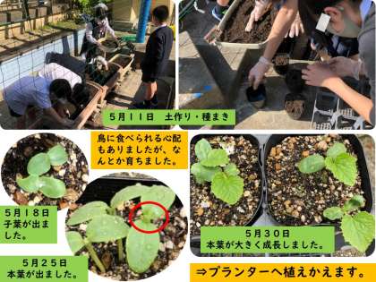 6月1日(木)6時間目の委員会活動の時間に、給食委員会では、なにわの伝統野菜である玉造黒門越瓜のプランターへの植えかえを行いました。5月11日に土づくり、種まきをしてから毎日成長を見守ってきましたが、本葉が大きく成長し、植えかえをできるまでになりました。自分たちで種まきをして発芽させた瓜の本葉を、児童はとてもやさしく慎重に扱っていました。瓜はつるが伸びて何メートルにも成長するので、多くを植えず、間隔をあけて1つのプランターに2つだけ植えかえました。このように野菜を育てる方法を一つ一つ経験しています。次は、摘心(実を大きくするために、新しく伸びてくる茎や枝を途中で摘み取ること)がまっています。