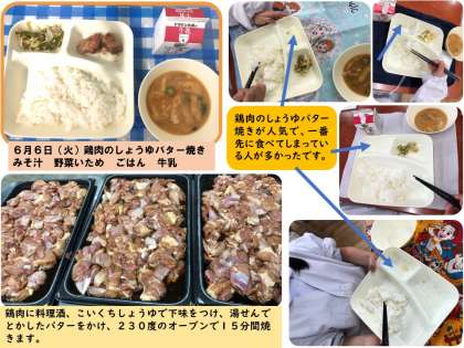 6日の火曜日に登場した鶏肉のしょうゆバター焼きは、毎回好評な献立です。今回もとても人気で、初めて食べる1年生も「これおいしい!!」「もう全部食べちゃった。」などと、あっという間に鶏肉を食べていました。どのクラスもみそ汁や野菜いため、ごはんまで全てよく食べていました。