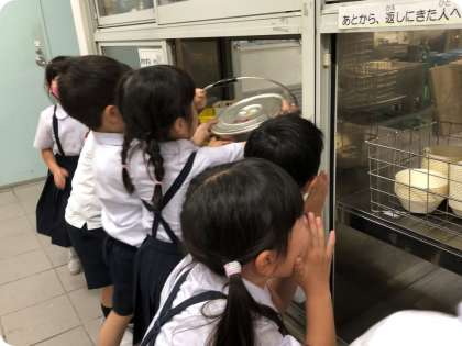 1年生は先日、生活科の学習で給食調理員さんに「お仕事をしていてうれしいことは何ですか?」という質問をしていました。その答えが「みんなが給食をおいしく食べて、給食室に返しにきた時においしかったですと言ってくれることです。」というものでした。それから給食室への返却の際は、いつも手をメガホンのようにして給食調理員さんに向かって「おいしかったです!!」と挨拶するようになりました。とても素直でかわいらしい1年生の様子です。