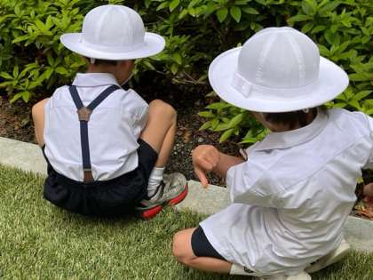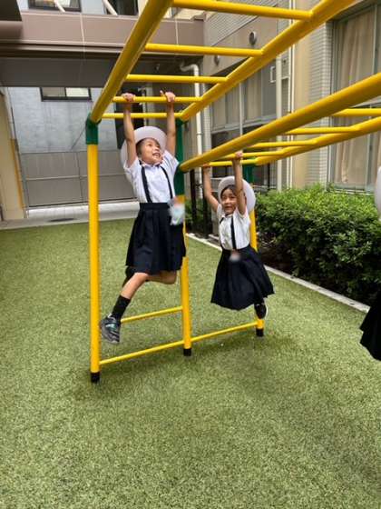 雨の多い今日この頃ですが、晴れた日は、運動場やオアシスで楽しく遊んでいます。頑張って「雲梯最後までいけたよ!」とか、「のぼり棒一番上にタッチできたよ!」と、目を輝かせて、手のひらにマメを作りながら、挑戦している子どももいます。虫が好きな子は、植え込みの中でダンゴムシを発見して、見せてくれました。