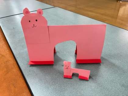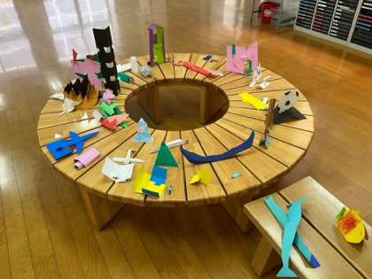 画用紙を切ったり折ったりして、乗り物や建物、動物などを作りました。