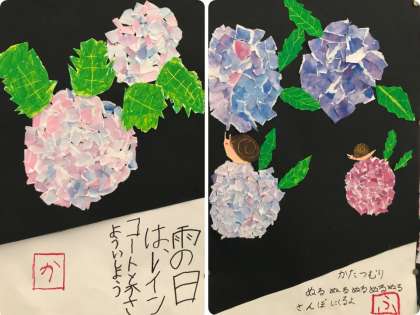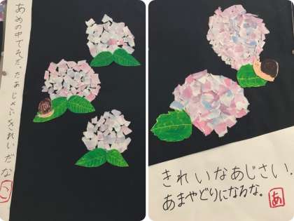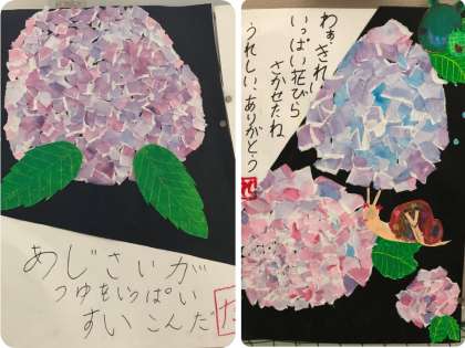 3年生が図画工作の学習で以前から取り組んでいた「あじさい」が完成しました。教室や階段の掲示板に貼られています。それぞれ、作った児童の個性や工夫したところがよくわかって、1つしかない作品が出来上がりました。最初の予定通り、詩も考えて書かれていて、あじさいやかたつむりと一緒に詩も読んで楽しむことができます。