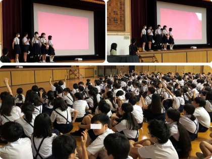 今朝の児童集会で集会委員会によるクイズがありました。何倍にもズームして撮られた写真を見て、それが何かをあてるクイズです。いつも学校で自分が使っているものでも、素材の細かい所までが見えるようなアップの写真になるとわからないもので、答えを聞いて「えー!!そうなの?」という反応が起こっていました。この赤いものの答えは、赤白帽です。