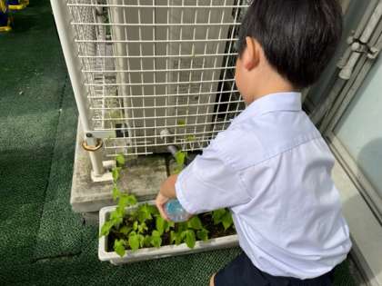 5月から育てているアサガオに花が咲き始めました。自分の鉢に花を見つけて大喜びの子、「まだ咲かない。」と少し不安気な子。シーズンはこれからです。毎日水やりをして、押し花を作ったり、色水遊びをしたり楽しみたいと思います。