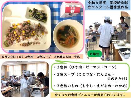 今日の給食は、令和4年度学校給食献立コンクール優秀賞作品で、阿倍野区丸山小学校の昨年度の6年生が考えた献立です。何日も前から6年生が「今度3色パーティーだよね。」と言っていました。「3色パーティーとは何のことだろう?」と思っていましたが、今日の献立が全て3色で食材も名前も統一されていたので、本校の6年生がそのように名前をつけていました。「そんなふうに名前をつけてもらったら、きっと丸山小学校の人達も喜ぶと思うよ。」と伝えました。本校の6年生の給食を楽しみにする気持ち、他校の6年生へのおめでとうという気持ちなど、どれもとてもすばらしい考え方です。そして今日、6年生は「とってもおいしい!!」と言いながらもりもり食べていました。