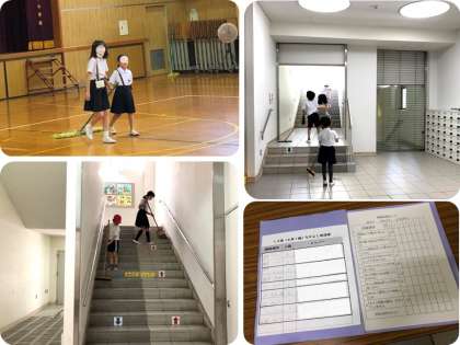 今日からなかよし班清掃が始まりました。毎週火曜日はなかよし班で分担して、学校中を清掃します。低学年の児童にとっては、日頃、清掃したことのないような場所を担当することもありますが、同じ班のお兄さん、お姉さんに丁寧に教えてもらいながら清掃していました。やさしく教えてもらえるので、低学年の児童は「楽しい!!」と言っていました。清掃が終わったら、いくつかの項目についてしっかりできていたか振り返りをします。